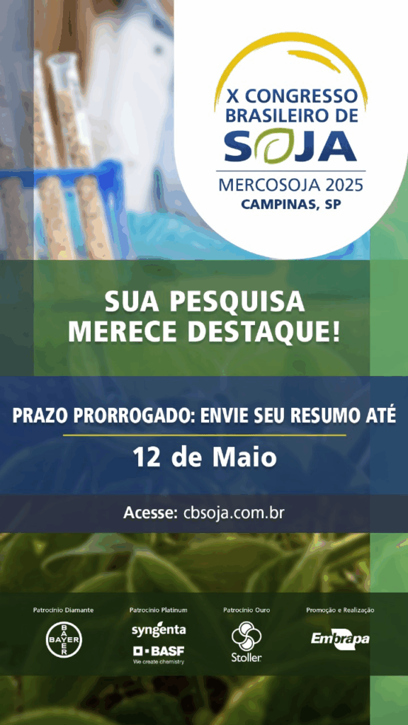O X Congresso Brasileiro de Soja (CBSoja) e o Mercosoja 2025, a serem realizados de 21 a 24 de julho de 2025, em Campinas (SP), prorrogaram o prazo para a submissão trabalhos técnico-científicos para o dia  12 de maio. Os trabalhos serão recebidos na forma de resumos e a apresentação será em formato pôster, em sessão previamente definida na programação técnica do evento. O autor principal ou apresentador deverá estar presente no local, ao lado de seu pôster físico, para esclarecimento de dúvidas, em horário definido na programação. Serão aceitos trabalhos em português, espanhol ou inglês. Acesse o site para conferir as normas.