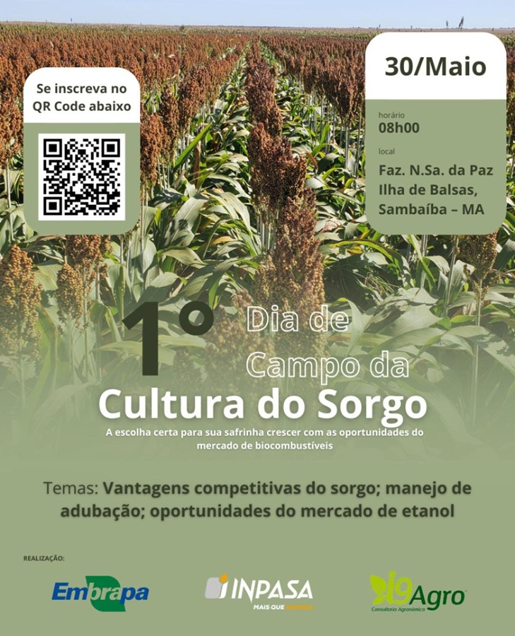 A Embrapa e a empresa Inpasa Brasil, em parceria com a empresa i9Agro Consultoria Agronômica, realizarão o 1º Dia de Campo da Cultura do Sorgo, dia 30 de maio, sexta-feira, às 8 horas da manhã, em Sambaíba, Maranhão.