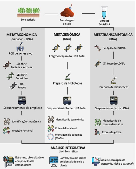 Esquema geral das abordagens analíticas para estudar o microbioma do solo em sistemas agrícolas